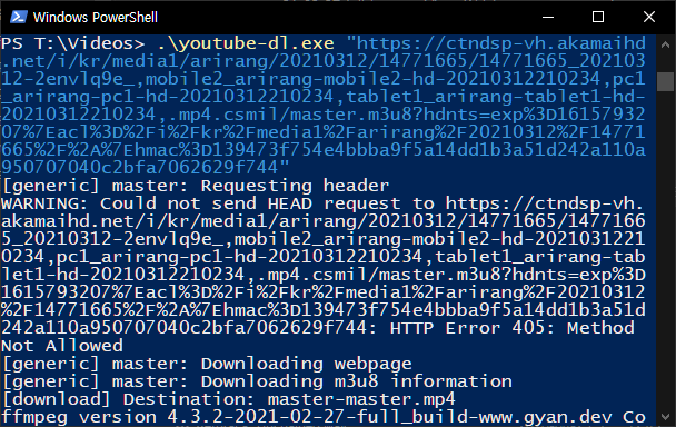 사실 이 글을 쓴 목적은 여기에 있다. 다운로드하고 싶은 영상을 찾았지만 기본 방법으로는 다운로드가 불가능했기 때문이다. 인터넷을 좀 뒤져보니 동영상의 m3u8 주소를 알아내면 된다고 한다. 이 방법에는 ffmpeg라는 별도 라이브러리가 필요하다.