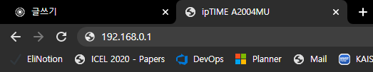 컴퓨터에서 웹브라우저를 켜고 공유기의 내부 아이피 주소를 입력한다. iptime 공유기 기준으로는 아래와 같이 192.168.0.1을 입력하면 된다. 통신사 또는 공유기 제조사별로 공유기 아이피 주소가 다르므로 잘 모르면 인터넷에 검색해 본다.