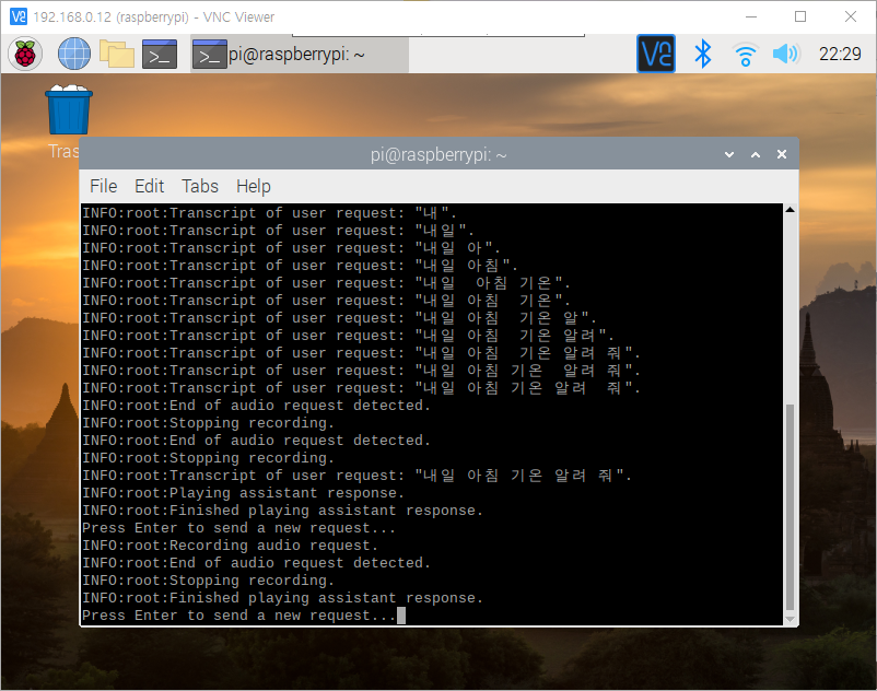 일단 샘플 코드로 위처럼 하는데는 성공했지만, 자동으로 음성을 인식하는 것이 아니라 엔터를 쳐줘야 다음 말을 인식한다는 단점이 있다. 다른 사람의 방법을 보면 무작정 1초 기다리고 다음을 인식하는데 이러면 계속 신호를 보내기 때문에 사생활 침해의 우려가 있을 것으로 생각했다.