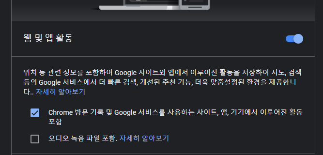 다음으로 구글 어카운트에 들어가서 웹 및 앱 활동을 켜준다.