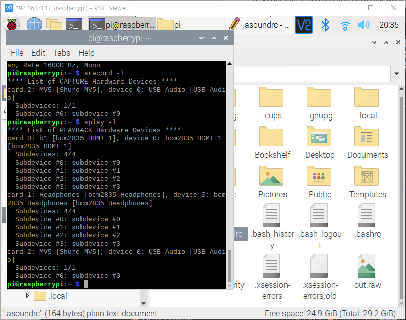 먼저 홈/pi 에 새 파일로 .asoundrc를 만들어준다. 참고로 파일탐색기에서 hidden파일 보기를 눌러줘야 .asoundrc가 보인다.