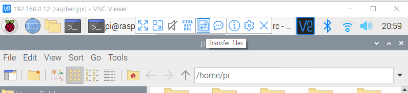 이름이 긴 json 파일이 받아진다. 이 파일을 VNC뷰어에서 가운데 위쪽에 숨어있던 transfer files 기능을 이용해 /home/pi로 전송한다. 공식문서에서처럼 ssh를 이용하는 scp를 써도 된다.
