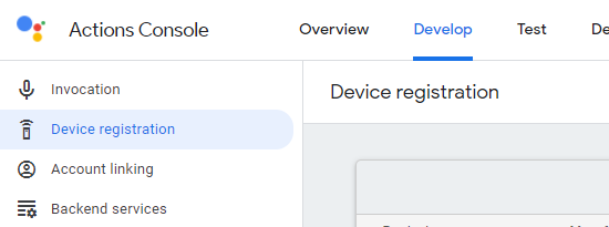 혹시 지나쳤다면 화면 상단의 develop 탭을 눌러 device registration을 한다. 디바이스 타입은 적당한게 없어서 TV로 골랐고, trait는 하나도 안골랐다.