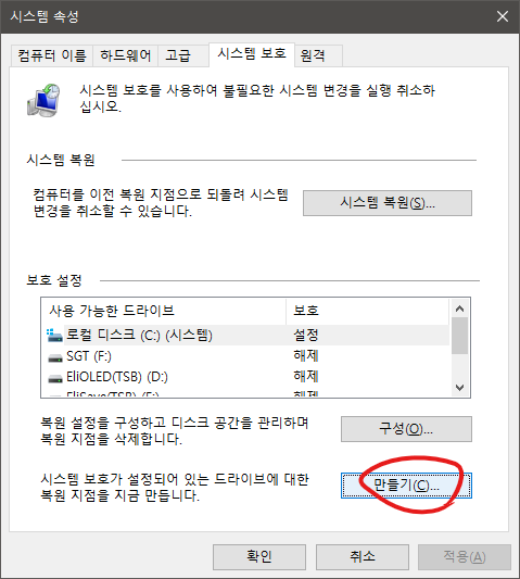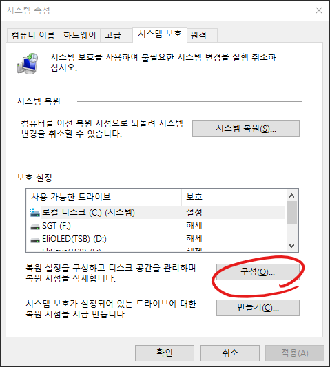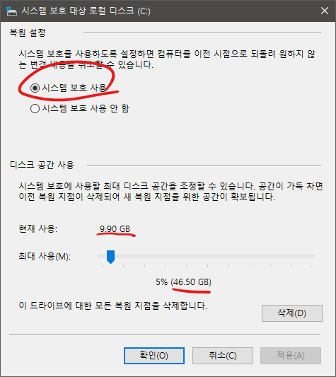 시스템 보호 사용에 체크되어있는지 보고 아래의 디스크 공간 최대사용이 현재 사용보다 크게 넉넉하게 잡는다. 본인의 경우 원래 1%, 10GB였는데 5% 46.5GB로 늘려서 혹시나 백업 안될 가능성을 차단했다.
