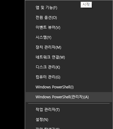 시작버튼을 우클릭해서 Windows Powershell(관리자) 라고 된 것을 누른다.
