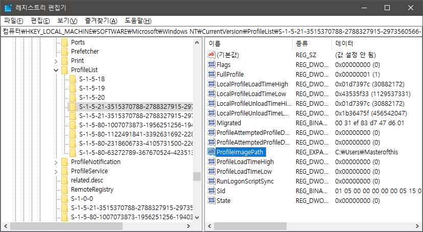 HKEY_LOCAL_MACHINE\SOFTWARE\Microsoft\Windows NT\CurrentVersion\ProfileList\아까기억한SID