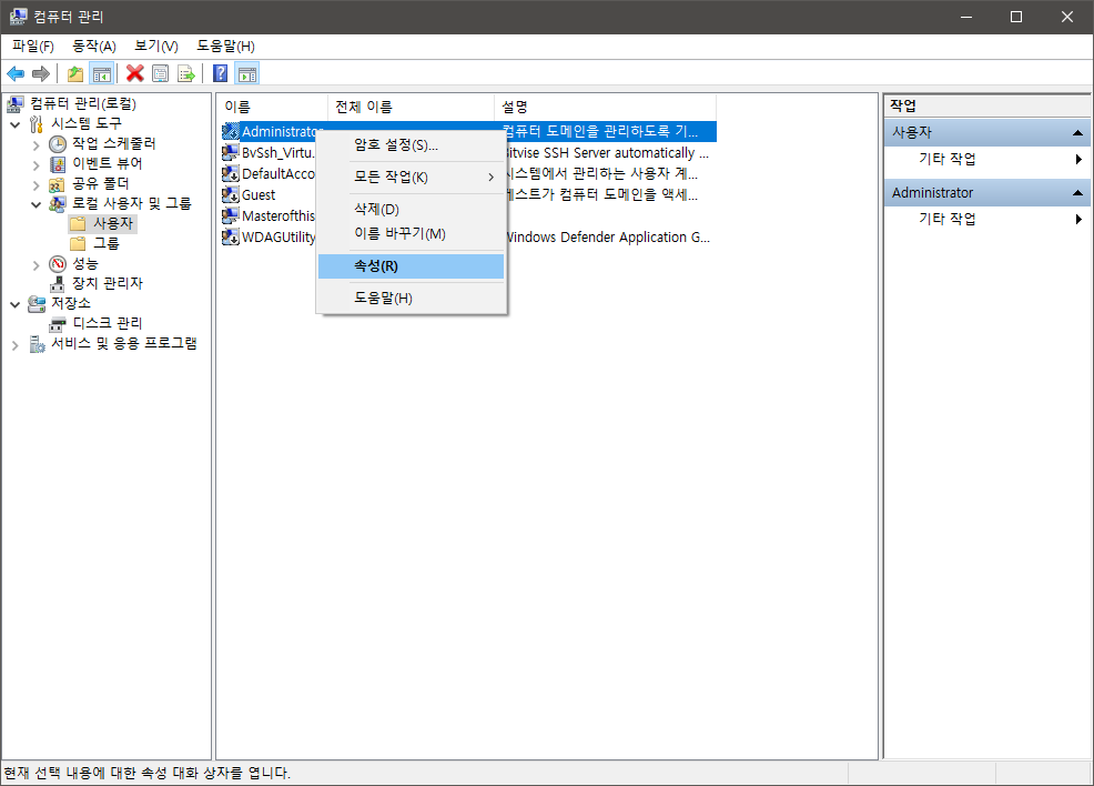빌트인 어드민 계정을 컴퓨터 관리에 들어가서 아까 2번의 역과정으로 비활성화해준다.