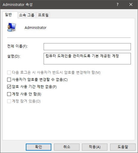 로컬 사용자 및 그룹-사용자에서 administrator라고 된 것에 속성 눌러서 계정 사용 안함 체크 풀기