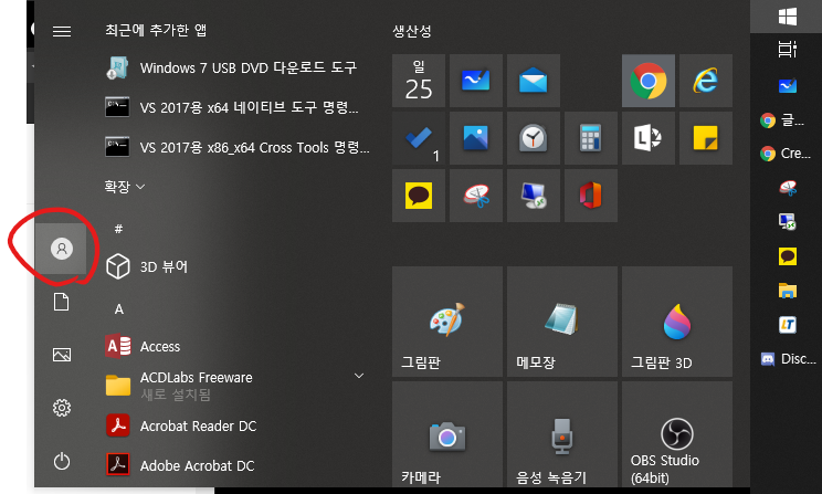 아까 빌트인 어드민 계정을 활성화 시켜놨기 때문에 시작 버튼 눌러서 왼쪽의 사람 모양을 누르면 못보던 administrator라는 것이 보일 것이다. 그걸 누른다. 그러면 로그아웃하지 않고 바로 어드민 계정으로 로그인된다.