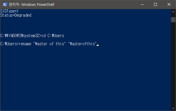 여기에서 권한에러가 난다면 관리자권한으로 되어있는지 확인하고, 명령어가 없다고 하면 cmd상태인지 확인한다. powershell에서는 rename 명령어가 없다.