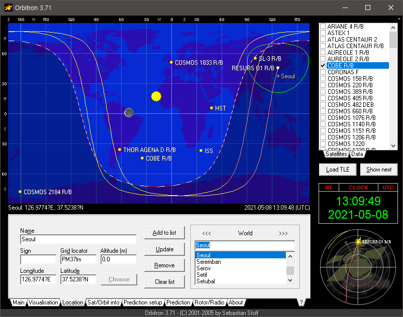 앞쪽의 메인 화면에는 우리나라에서 발사한 위성 몇 개의 궤적이 실시간으로 업데이트되고 있었다. (뭐 대충 아래 사진과 비슷한 느낌인데 천문연 시설은 훨씬 고퀄이다)