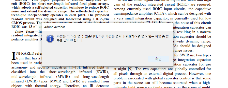 작년에 수많은 참고문헌을 정리할 일이 있어서 pdf를 많이 열었는데 50개까지만 열리고 더 열려고 하면 위 캡쳐화면처럼 '파일을 더 이상 열 수 없습니다. 다른 파일을 열거나 인쇄하려면 열려 있는 파일 중 일부를 닫아야 합니다' 라고 나온다. 더 열고싶으면 몇 개를 닫고 다른 것을 열어야 하는 경우가 생겼다.