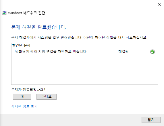 아래와 유사한 창이 뜨면서 방화벽 에러라고 나왔다. 여기에서 문제 해결 버튼을 누르니 해결됨이라고 나왔다. 평소에 자동 문제 해결을 눌러도 안되는 경우가 많아서 반신반의하면서 빠른지원을 다시 켰는데...