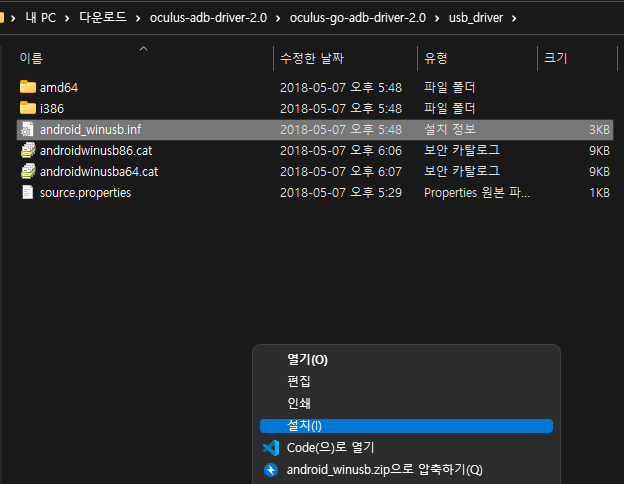 압축을 풀면 잡다한 파일들이 나올텐데 android_winusb.inf 파일을 우클릭 후 설치 눌러주면 된다. windows 11에서는 옵션 더보기 버튼을 눌러야 제대로 나온다. 컴맹들을 위해 많이 쓰는것만 남기고 나머지는 숨겨놓은건 알겠는데 뭐 할때마다 옵션 더보기 누르는게 개발자 입장에서는 매우 불편하다.