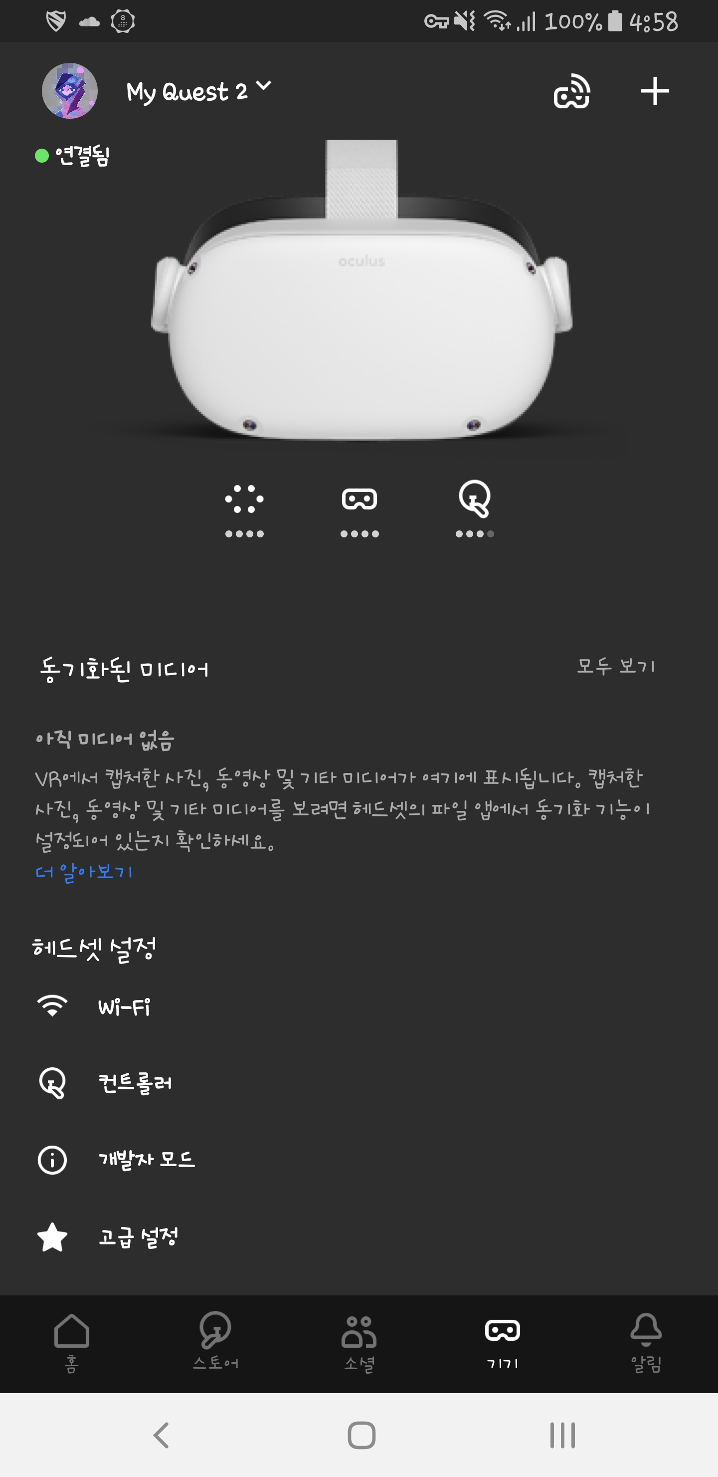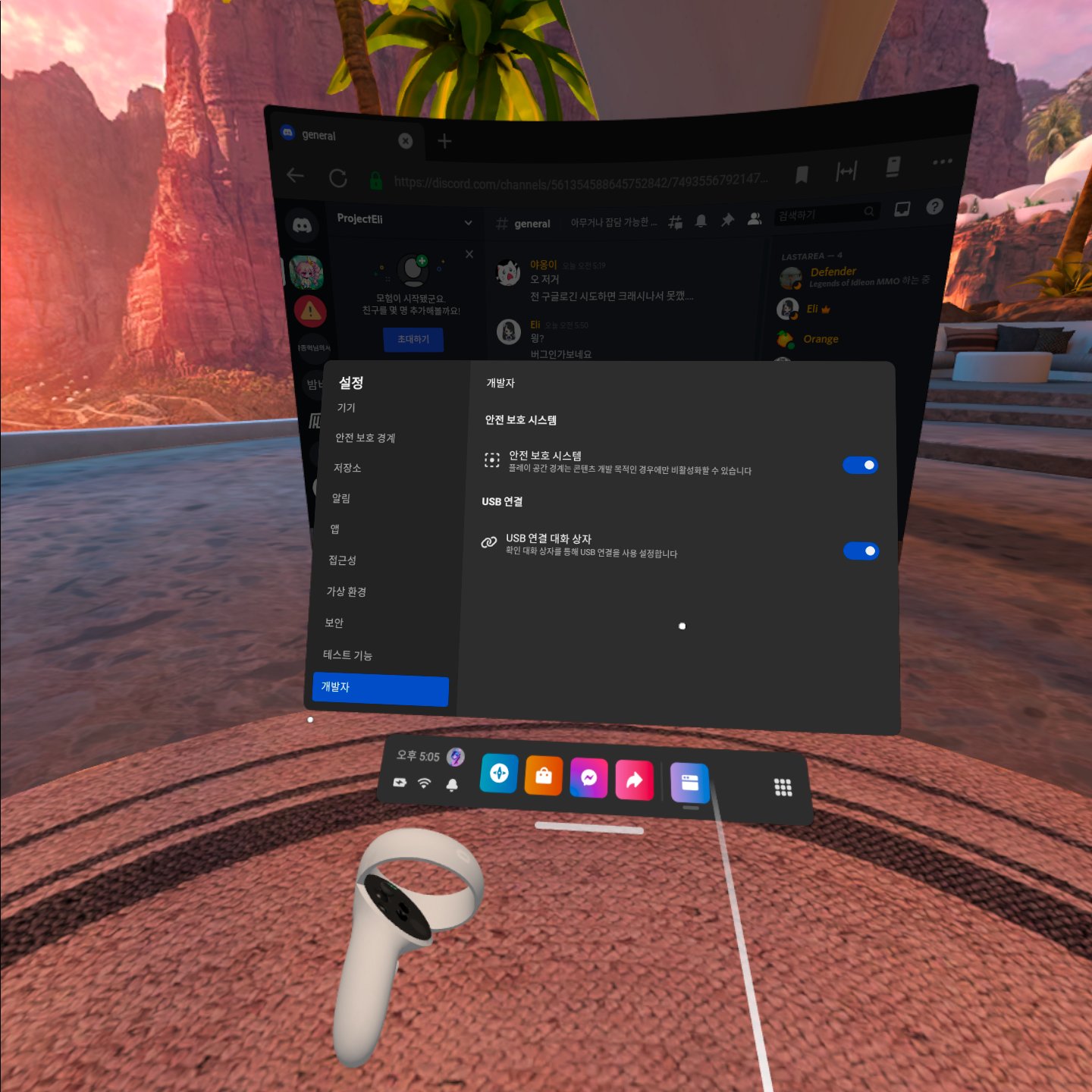 오큘러스 기기 화면에서도 설정에 새로 개발자 옵션이 생긴 것을 알 수 있다.