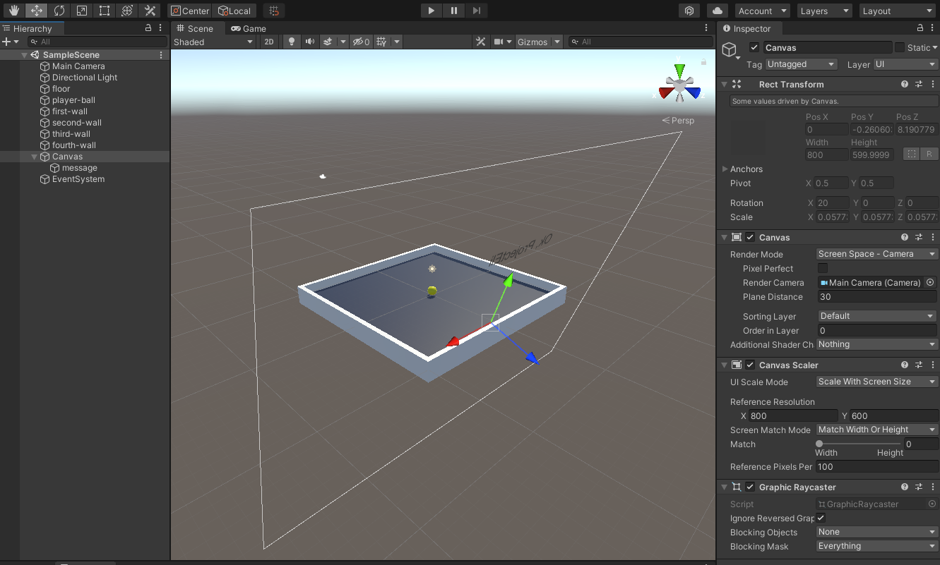 간만에 유니티를 켜보니 감회가 새로웠다. 대충 튜토리얼의 최종형태는 당구판같이 생긴거 위에 공이 놓여있고 방향키로 조작하다가 벽에 부딪치면 벽 색깔 바뀌면서 공중에 있는 텍스트가 바뀌는 앱이다.