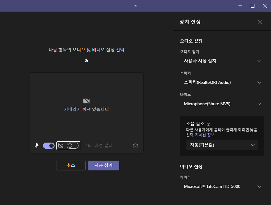 컴맹한테는 마이크나 스피커 세팅도 고역이다. 이런 부분이 쉽게 될 수 있는지 체크해 보았다. 회의 시작시 방에 참여 전에 아래 캡쳐화면과 같이 아주 직관적으로 세팅할 수 있다. zoom같은경우 이정도까지 편하게 되어있진 않기 때문에 MS teams의 1승.