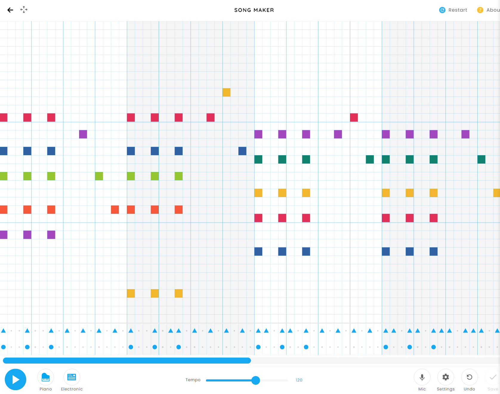 일반적인 작곡 프로그램의 piano roll을 그대로 옮겨 놓은듯한 모습이다. 세팅에 들어가서 scale을 chromatic으로 하고 split beat를 4로, range를 3옥타브로 하면 풀 포텐을 다 쓸 수 있다. 역시 저장도 되고 공유도 가능하다. 간단하게 악상 스케치하기엔 좋은데, 노트 길이를 변화시킬 수 없고 3옥타브밖에 안되는게 단점이긴 하다. 그럼에도 불구하고 관짝소년단 노래나 BTS 음악같은것도 넣는 사람도 있는 것 같다.