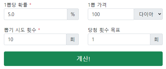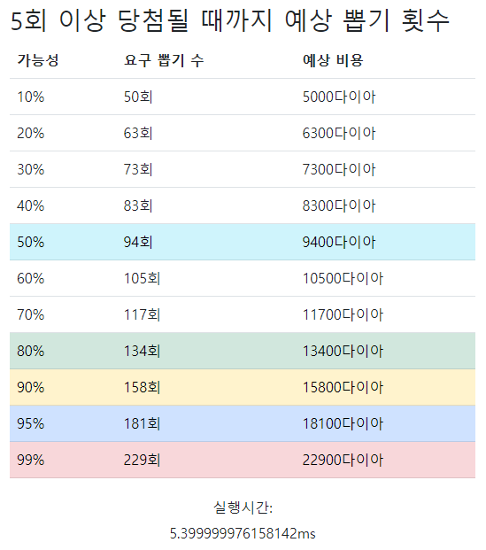 이제 대망의 예상 뽑기 횟수이다. 여기서는 내가 입력했던 뽑기 수가 무시되고, 앞에서 입력했던 목표 횟수가 확정적으로 나오려면 몇번이나 뽑아야되는지에 대해서 보여 준다.