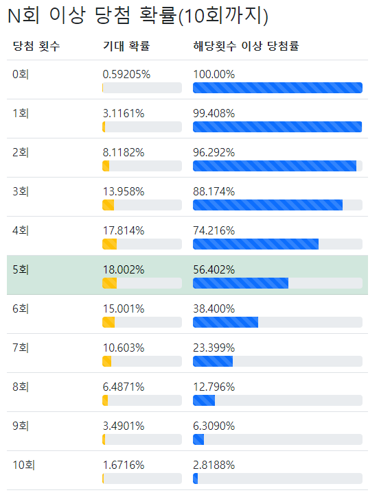 다음으로 보여주는 정보는 위의 사진과 같이 0~10회까지 정확하게 당첨될 확률이 노란색 바로 표시되고, 내가 입력한 뽑기 횟수를 뽑았을 때 해당 횟수 이상 당첨될 확률은 파란색 바로 표시된다. 입력한 목표 당첨수가 10회 이하이면 초록색으로 강조해 준다. 목표 당첨수가 작은 경우에는 유용하게 활용할 수 있을 것이다.