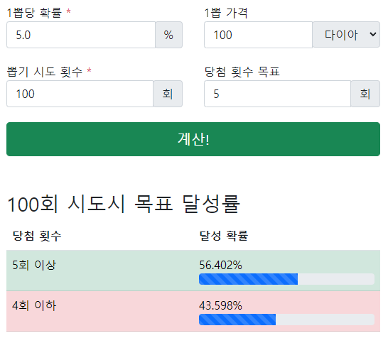 처음 나오는 결과로는 내가 적은 당첨 횟수 목표를 달성할 확률이 몇%나 되는지 계산해 준다. 5%짜리를 100번 뽑으면 5번 나올 확률이 절반이 약간 넘는 수준이다. 상식적으로 5%면 5번 나와야되는거 아니야? 라고 생각할 수 있지만 실제로는 5번도 못뽑을 확률이 무려 44%정도나 된다. 여기까지는 뽑기 많이 해본 사람들에게는 별로 감흥이 없는 정보이다. 다음으로 넘어가 보자.