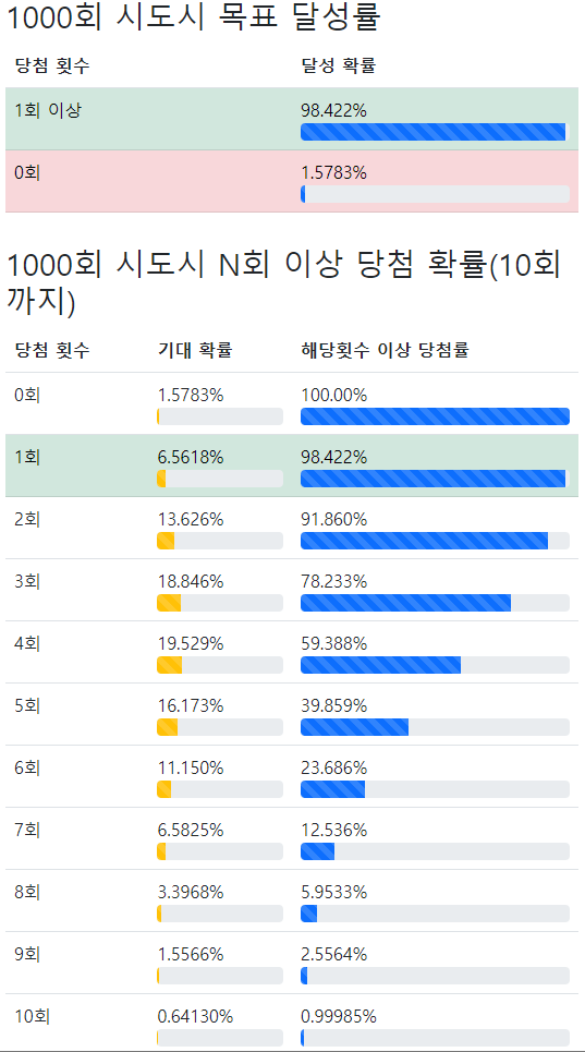 와후리 사이트에서 확률 결과를 정확히 k번 뽑는 경우와 k번 이상 뽑는 경우를 섞어서 보여주는 점이 마음에 들지 않았어서 나는 두 경우를 분리해서 다음과 같이 표시했다. 첫 번째 표에서 목표 달성률을 확인시켜주고, 두 번째 표에서 정확히 k번 뽑는 기대 확률과 해당횟수 이상 당첨률을 차례로 표시해 주어 혼동을 방지하였다.