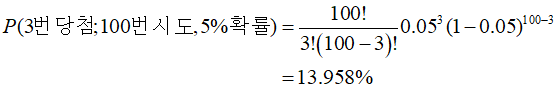 예를 들어 당첨확률 5%짜리 뽑기를 100번 돌렸을 때 정확히 3번 당첨될 확률은 다음과 같이 계산된다.