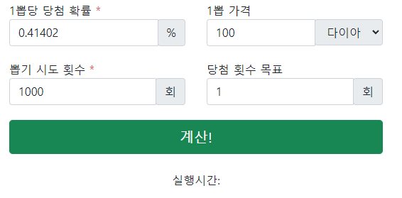 반면 일본 사이트의 경우 확률에 작은 숫자를 넣더라도 거의 즉각적으로 계산결과가 나왔다. 어떻게 했는지에 대해서 설명을 찾아봐도 잘 찾아지지가 않았다. 나도 무지성으로 1번 뽑기부터 서서히 늘려가는 방식을 시도해 봤는데 확률이 0.1%만 되어도 계산시간이 몇 초 이상, 0.01%면 수십 초 이상 걸려버리는 현상을 겪었다. 이대로라면 국내 확률형 아이템 중 1퍼센트 미만에 대해서는 계산 눌러놓고 결과 기다려야 하는 시간때문에 매우 귀찮아지는 상황이 자주 나오게 될 것으로 예상했다.