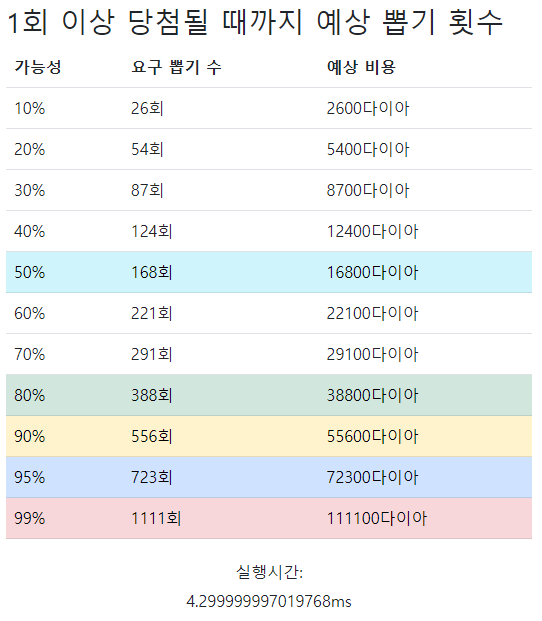 그리고 다음과 같이 이 계산기를 만들려고 했던 핵심 데이터인 예상 뽑기 횟수를 각 %별로 표시하였다. 이 때 다른 사이트들에서 95%가 없어서 내 계산에는 95%도 넣었다. 예전에 메이플 할때 70% 주문서가 일요일에 확률 95%까지 올리는 버닝 타임?같은게 있었는데 그런 걸 보면 확정적=95% 정도로 해석할 수 있을 것 같아서 이 숫자도 중요하다고 생각한다. 마지막으로 계산하는데 걸리는 시간도 계산이 끝난 후에 맨 아래에 표시해주었다. 이로써 이틀간의 개발 작업이 완료되었다.