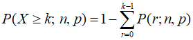 앞에서는 정확하게 k번 당첨될 확률을 계산하는 방법에 대해서 다뤘는데, 어차피 뽑기할때는 정확하게 k번 당첨될 확률보다는 k번 이상 당첨될 확률을 구하는 것이 더 의미가 있을 것이다. 이것을 구하기 위해서는 0번부터 k-1번까지 당첨될 확률을 계산해서 1에서 빼주면 된다. k가 크면 뒤쪽부터 계산하는게 좋겠지만 보통 확률이 낮으므로 원하는 당첨횟수 k가 작을 것이기 때문에 앞쪽부터 계산해서 빼주는 것이 더 효율적일 가능성이 높다. 이를 수식으로 표현하면 다음과 같다. 주의할 점은 k번 이상이 필요하므로 k를 포함시키지 않는 k-1번의 확률까지 계산한 다음 1에서 빼주는 부분이다.