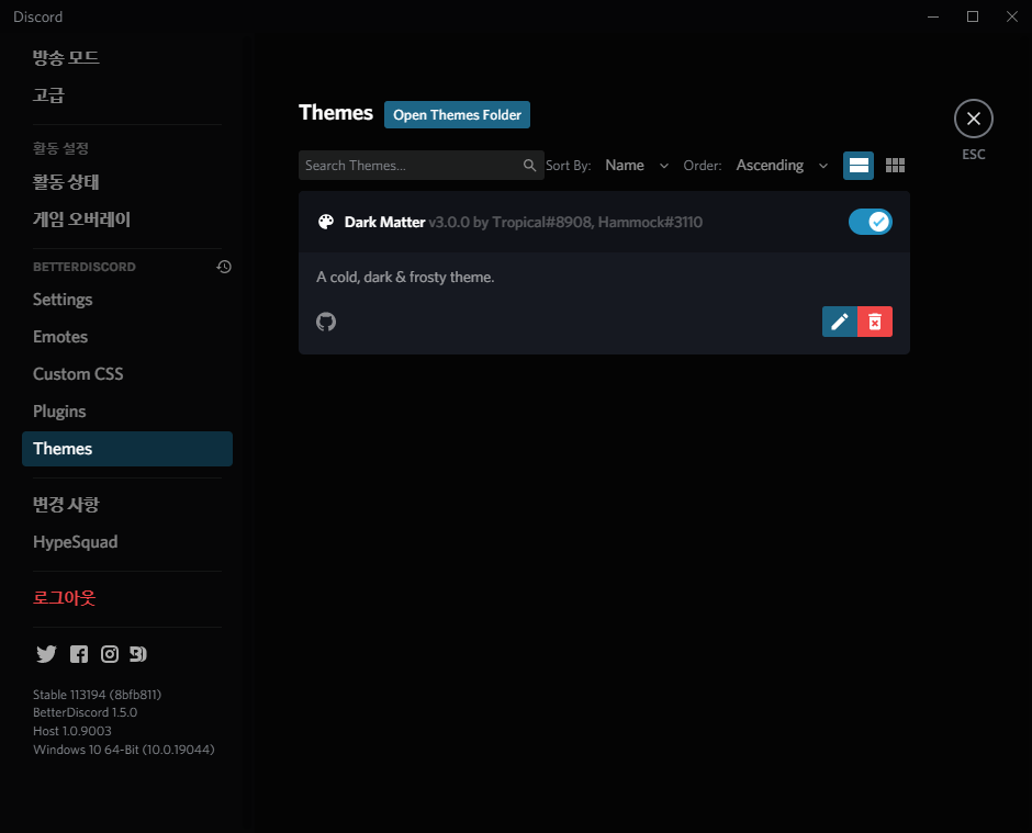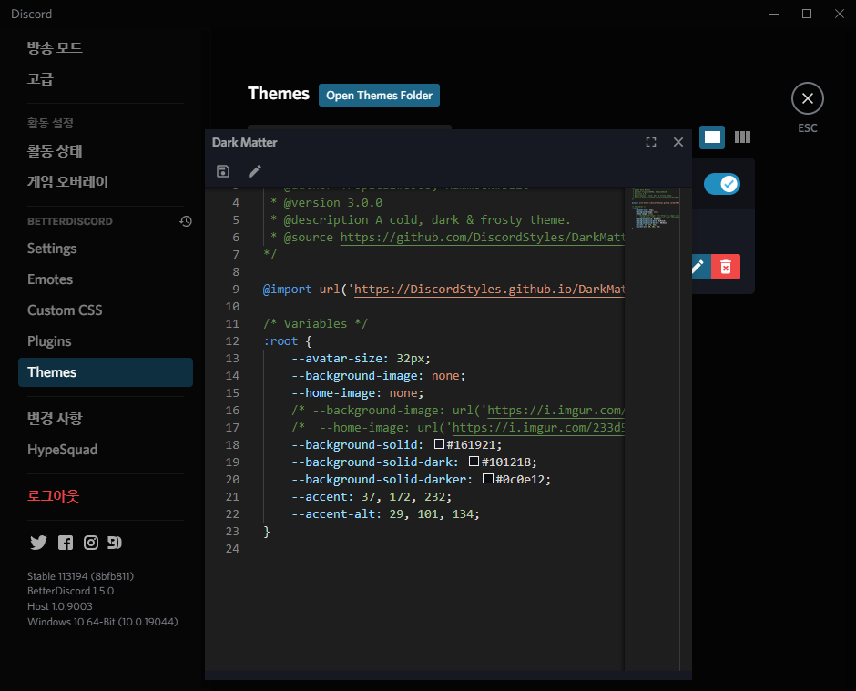 나는 Dark matter라는 것을 받았는데, 최대한 UI를 건들지 않고 색만 검은색으로 바꿔줘서 좋았다. 하지만 배경 이미지가 생겨서 css를 수정해야 했다.