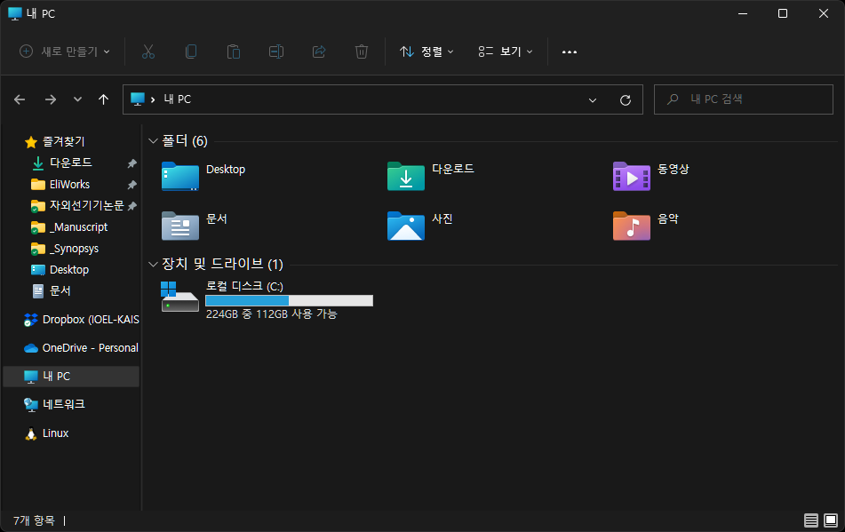 설정을 완료했다면 아래와 같이 파일 탐색기가 어두운 색으로 변한다.