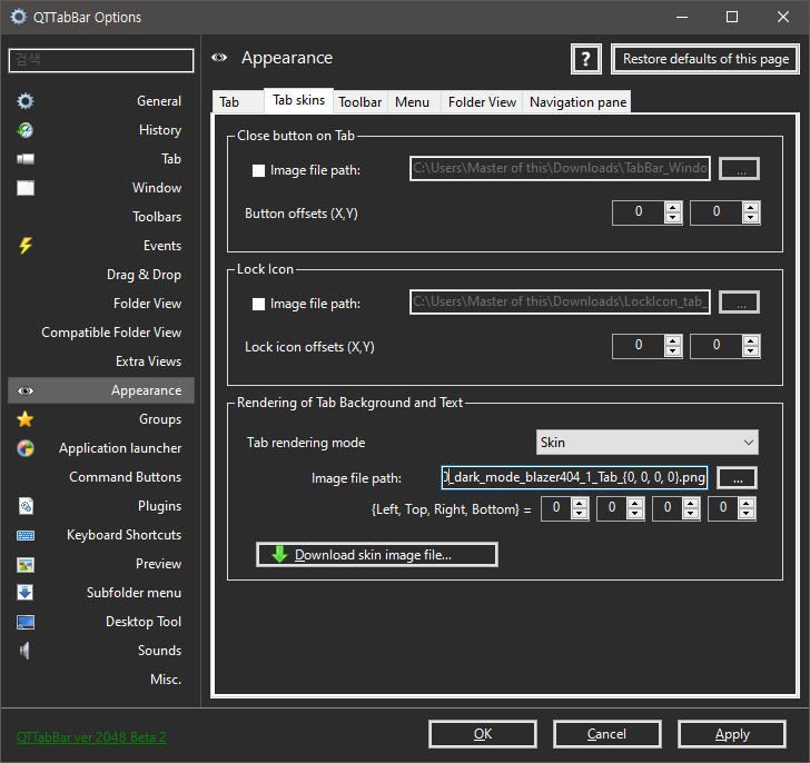 3. (선택) 나는 파일 탐색기의 탭을 여러 개 쓰기 위해서 QuizoApps의 QTTabbar라는 것을 쓰고 있는데, 옵션 창에서 아래와 같이 appearance 탭에 들어가면 community skin file을 받을 수 있다. 어두운 색 적당히 골라서 받아주면 된다.
