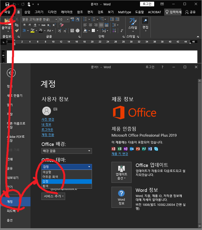 MS Word 및 오피스 제품군에 다크 테마 적용