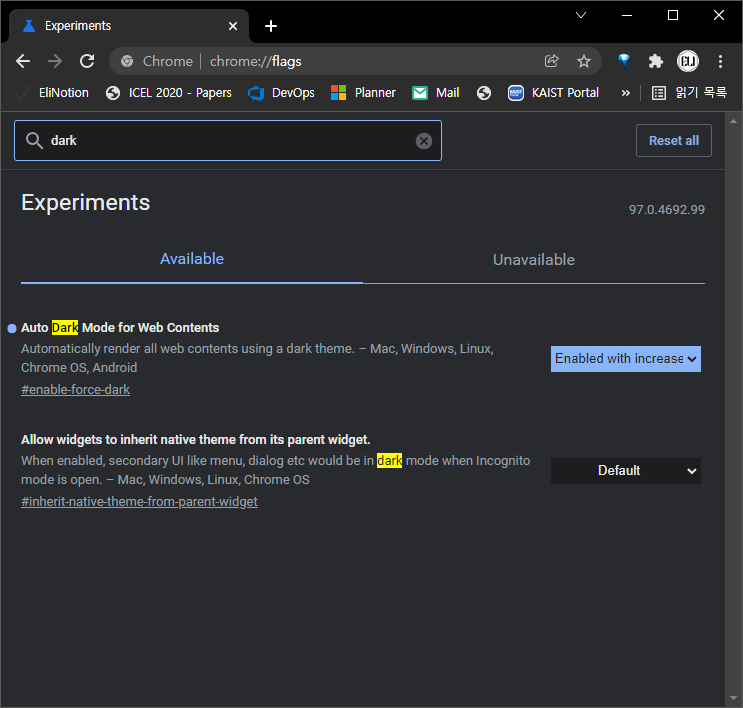 2. 검색창에 dark를 적으면 dark mode 관련된게 나올텐데 자신이 원하는 다크 모드를 선택해 주면 된다. 나는 enabled with increased text contrast로 골랐다.