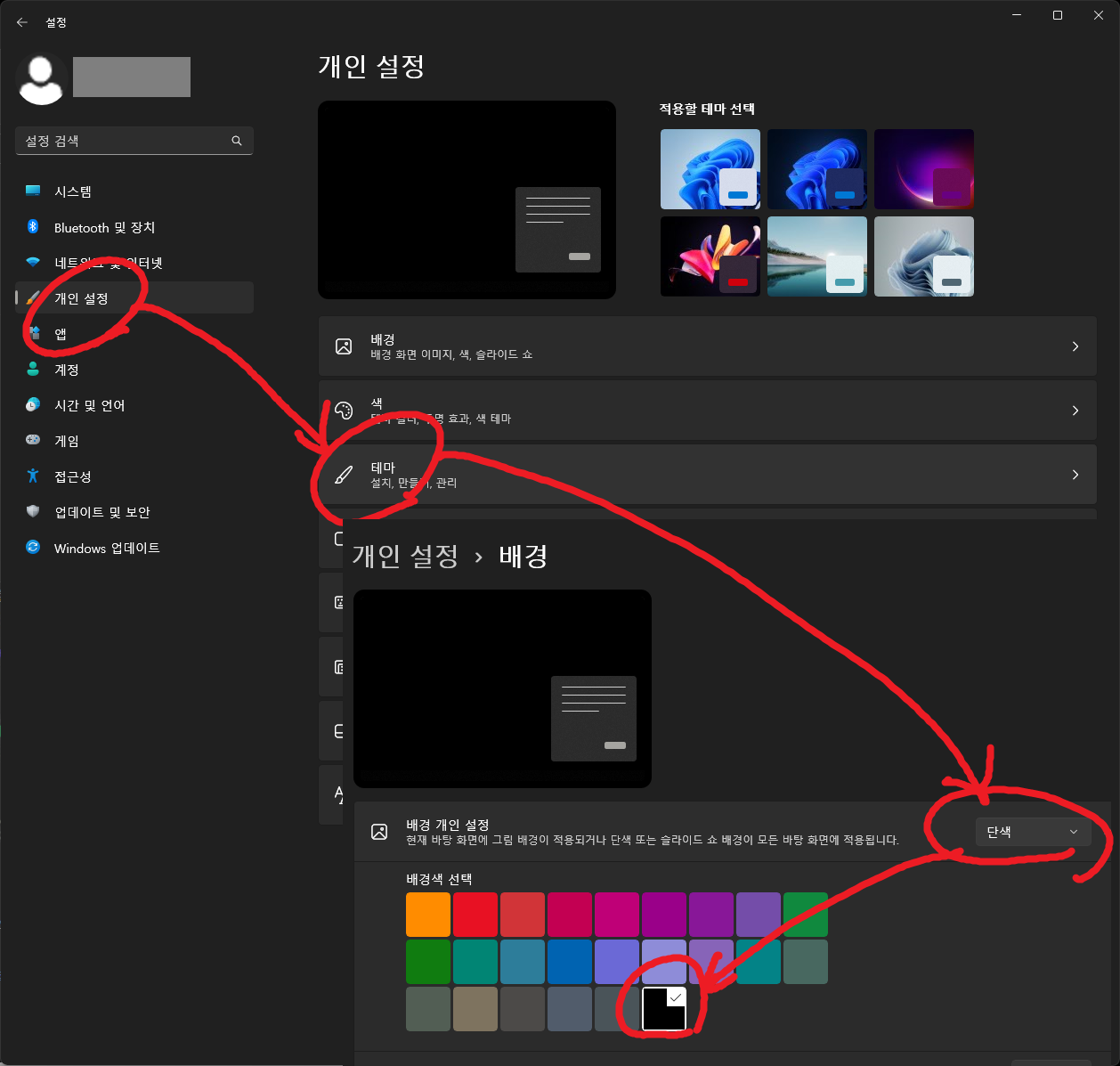 2. 단색 테마를 고르고 어두운 색으로 지정한다.