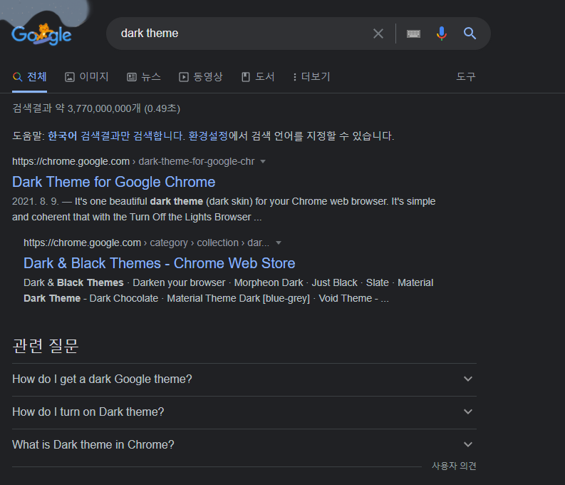3. (선택) 참고로 위쪽 탭도 검게 하고 싶으면 크롬에 적용되는 테마를 바꿔 주면 된다. 나는 다음의 Just black이라는 테마를 사용하고 있다.