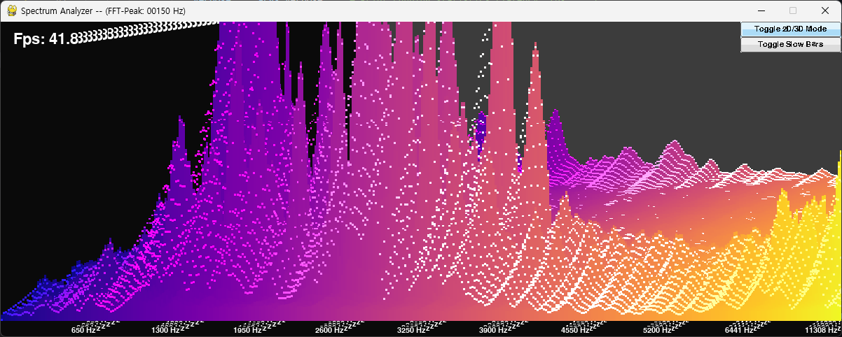 pygame+openGL 기반의 audio spectrum visualizer이다. 오래된 라이브러리들을 쓰고 있어서 그런지 정확한 이유는 모르겠지만 3D로 해보니 위와 같이 잔상이 남는다. 설치하란대로 pip requirements를 하니 자꾸 에러가 나서 그냥 직접 requirements.txt안에 있는걸 conda virtualenv에 설치했더니 라이브러리 설치문제는 없었다. 그리고 실행해보니 float 관련 에러가 자꾸 나서 visualizer.py의 에러난 210~213 line을 그냥 주석처리 해버렸더니 위와 같이 나왔다. 좋았던 점은 일반적인 signal processing하는 FFT 그래프들이 오른쪽 끝까지 표시하느라 monstercat같은 느낌을 내지 못하는데 이건 약 1.2kHz에서 끊어서 파형이 좀 더 사용자 친화적으로 잘 보인다. 다만 여러모로 쓸데없는 기능이 많이 들어가서 나같은 minimalist에게는 과한 느낌. pygame을 쓰다보니 fps도 40근처밖에 안나오고 퍼포먼스 이슈도 있을 것 같다. 아무래도 native C#에 비해서는 느릴 수밖에 없는 python의 GUI...