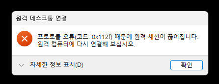 위와 같이 사용하고 있었는데 특정 윈도우 업데이트 이후에 모니터 1개에서 접속할 때도 아래와 같이 오류 코드 0x112f 문제가 발생했다. 이를 통해 remote desktop protocol에 뭔가 문제가 있음을 추측할 수 있었다.