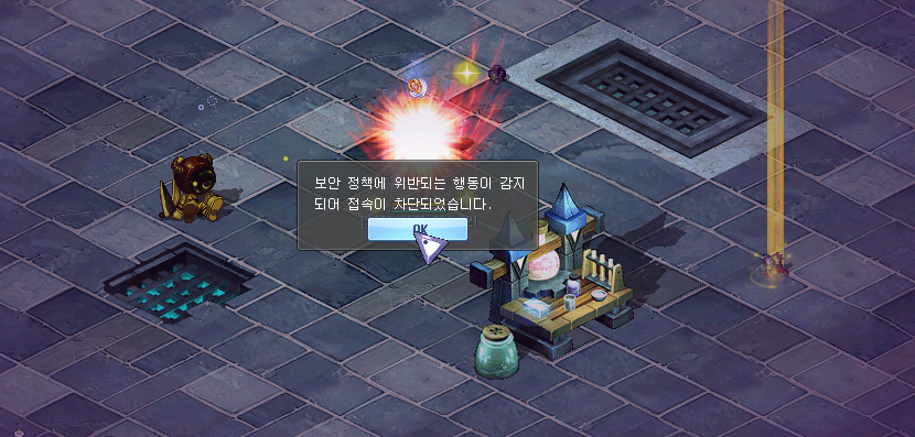 게임을 켜고 사냥이나 컨텐츠(필드보스, 퀘스트 등등)을 하다 보면 예상치 못한 시점에 '보안 정책에 위반되는 행동이 감지되어 접속이 차단되었습니다.' 라는 창이 뜨면서 게임이 꺼짐. 또는 잠수를 태워놓고 일정 시간이 지나고 와보면 동일한 창이 뜨면서 게임이 튕김.