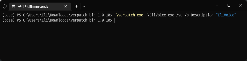 verpatch는 CUI 프로그램이므로 해당 폴더에서 관리자권한 터미널을 열어 준다 (혹시모를 권한문제 방지). 그리고 다음과 같은 형식으로 입력해주면 끝.