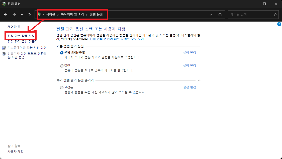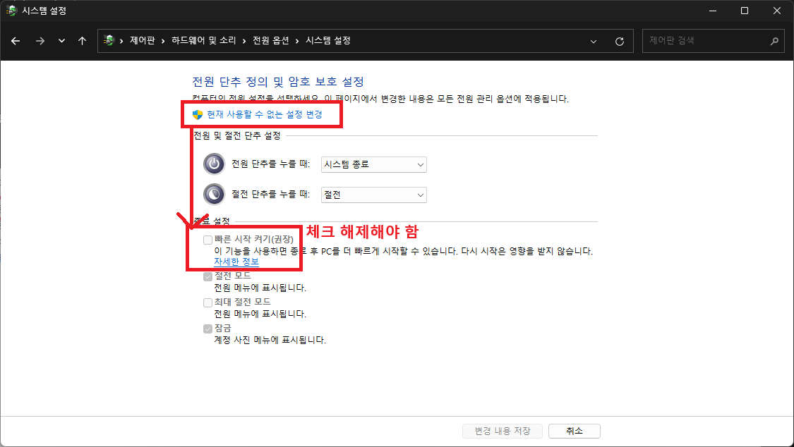 문제원인: 윈도우 업데이트 이후 전원 설정에서 빠른 시작이 켜기로 돌아가 있음