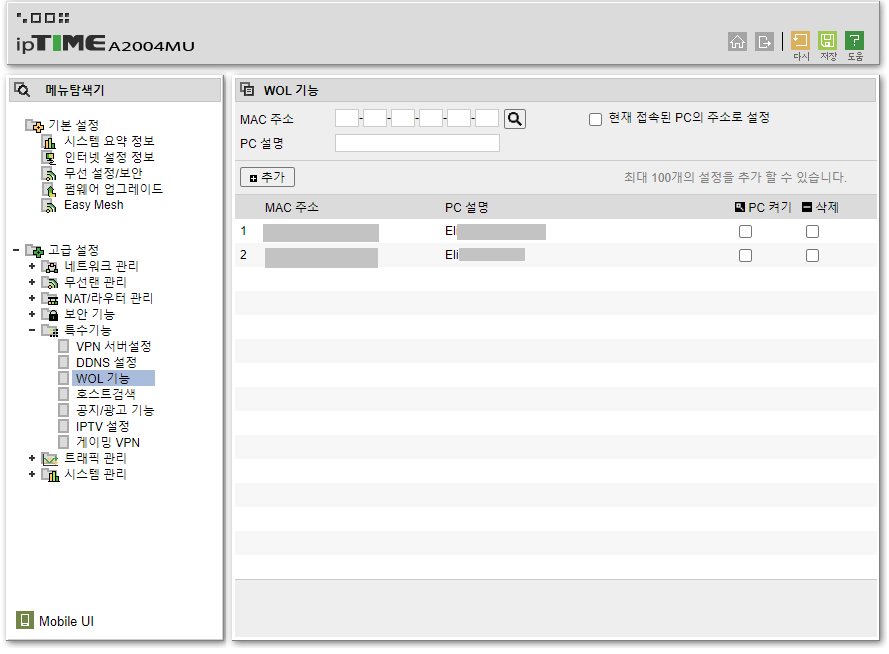 본인 공유기에는 WOL기능이 있어서 쉽게 설정할 수 있었다. WOL로 켜려는 컴퓨터의 MAC주소를 등록하고, 외부에서 접속 가능한 관리 페이지에 들어가서 컴퓨터 전원켜기를 눌러주면 된다. 대략 아래와 같다.