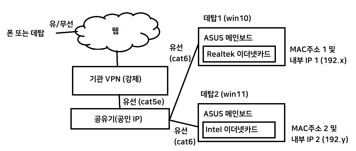 내 소속 기관의 경우 일반적으로 컴퓨터별로 공인 ip를 고정 ip로 부여하기 때문에 원리적으로는 공유기가 필요 없지만, 보안상 이유 및 여러 이유로 인해 현재 iptime 공유기를 사용하고 있고, 공인 아이피는 공유기에 할당을 시켜 뒀다. 그리고 내부아이피로 컴퓨터 2대가 있는 상태이다. 즉, 외부-공유기(공인아이피 및 DDNS)-컴퓨터(내부아이피) 로 연결되어있다.