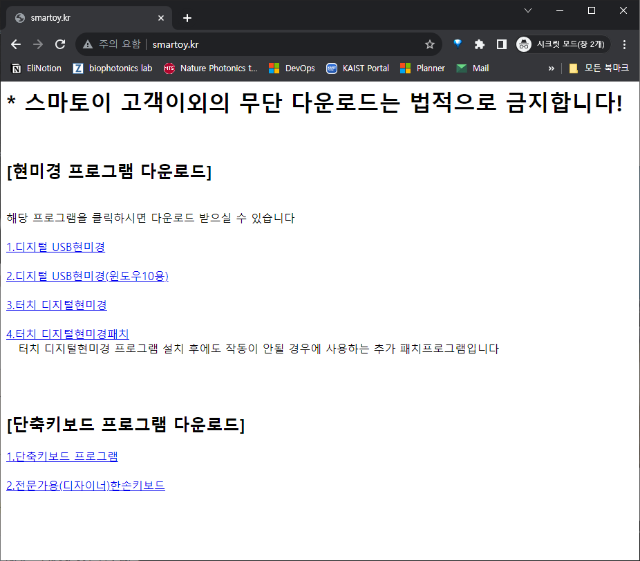 기본적으로 키보드를 연결하면 1~9번 버튼은 abcd 순으로 할당되어있고, 노브는 기능 할당이 안 되어 있었던 것 같다. 이를 변경하려면 홈페이지(smartoy.kr)에 들어가서 프로그램을 받아 줘야 한다. 그런데 홈페이지가 아래와 같이 너무 단순하게 생겼다. 제품에 대한 자신감인지 뭔지 아니면 디자인같은 거 모르는 공돌이가 만든 건지 흰 배경에 기본 폰트로 된 글자뿐이고 필요한 기능 외에는 아무것도 없다. 그런데 A/S를 위한 고객센터 연락처같은 것도 없다... 이 부분은 좀 아쉽긴 하지만 어쨌거나 나는 기능 불량은 아직 안겪고 있고 프로그램도 잘 돼서 문제 없이 쓰고 있다.