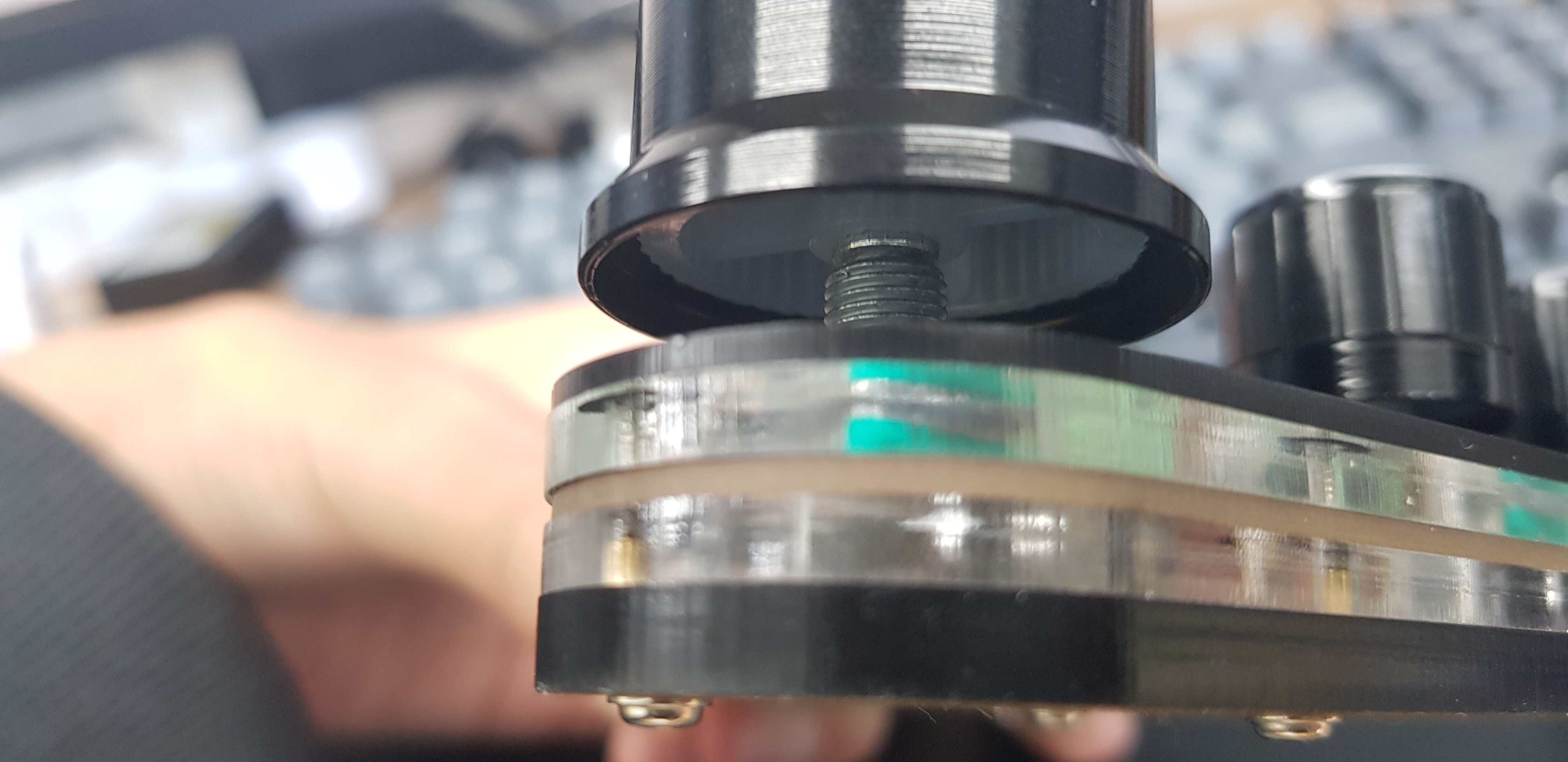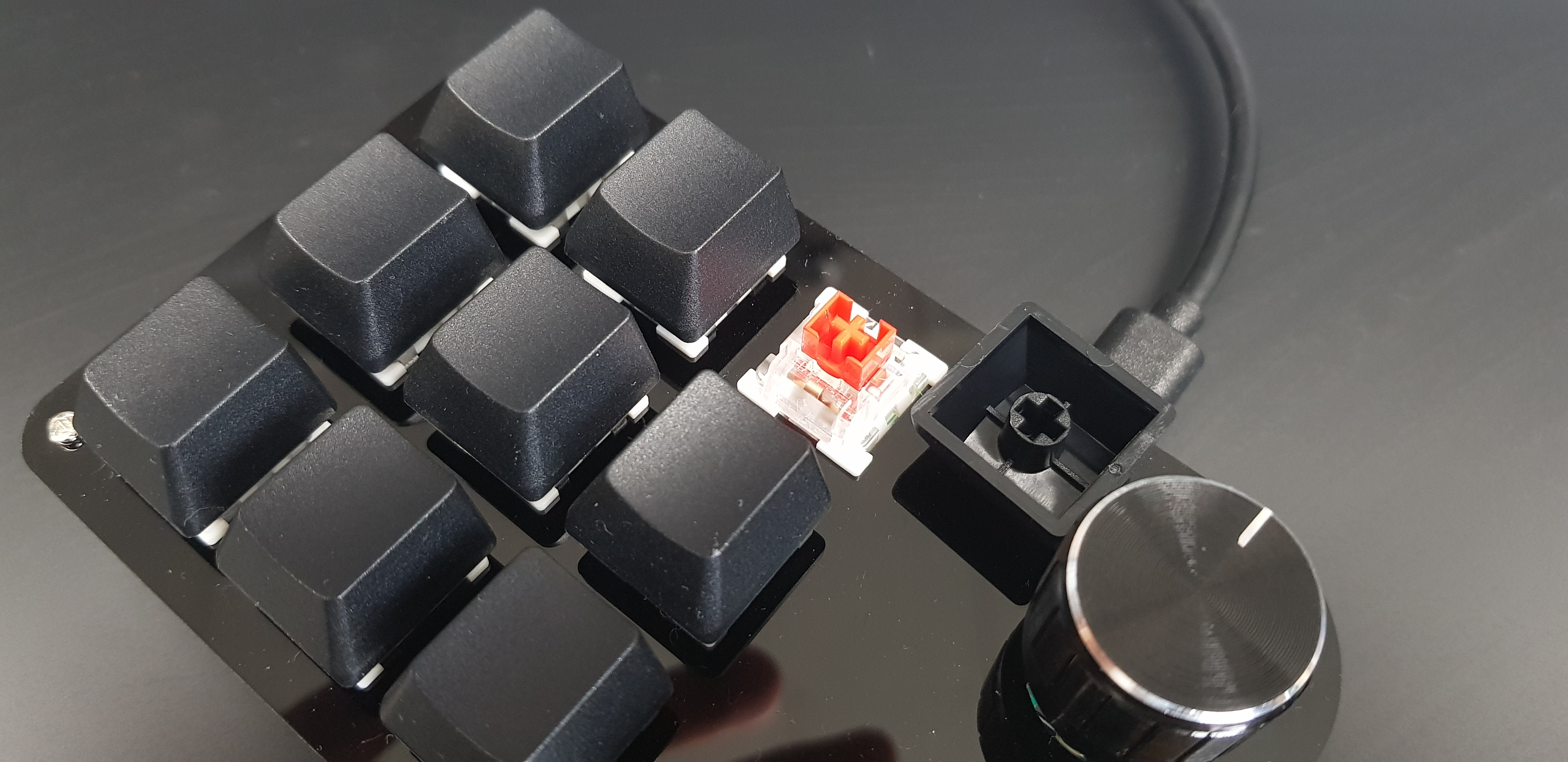 혹시 몰라서 직접 키캡을 뽑아 보니 아래 사진과 같이 축과 키캡 사이에 방향성은 없어서 원하지 않는 경우 키캡만 90도 돌려서 끼우고 원하는 방향으로 사용하면 된다. 다른 방향도 써봤는데 노브 돌리는 게 메인인 내 목적상 손배치가 여러 모로 최적이 아니라는 생각이 들어서 현재에는 원래 설계된 방향대로 쓰고 있다. 만약 다른 방향 쓸거면 USB가 한쪽에만 꽂혀서 선 정리에 주의해야 할 듯.