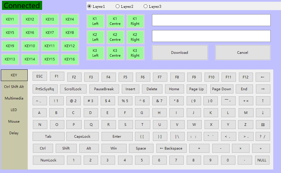 직접 프로그램 받아서 확인해봐도 되겠지만 홈페이지만큼이나 키 매핑 프로그램도 아름다움따위는 전혀 추구하지 않은듯한 느낌으로 되어 있다. 제품 설명 페이지에서 제시되어 있는 것처럼 키 할당이 가능한데, 내 키보드에 있는 것을 눌러서 키 코드로 인식하는 것이 아니라 보이는 그림에서 키 조합을 눌러서 할당하는 방식이다. 모든 키를 테스트해보지는 않았는데 대충 아래와 같은 키들을 할당할 수 있고, 한영 키는 할당 안되는 것으로 보인다.