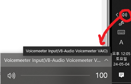 이렇게 설정하면 컴퓨터에서 나오는 모든 소리가 voicemeeter input이라는 곳으로 출력된다. 다음으로 작업 표시줄의 소리 버튼을 좌클릭하여 동일하게 변경해 준다. 소리 크기 기본은 100이다.