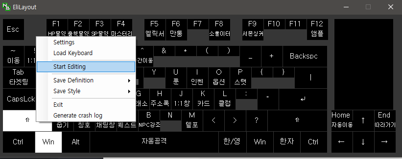 켜서 보면 기본 키보드는 파란 바탕에 흰색 글씨로 되어 있어서 색감이 안 맞을 텐데, 본인의 취향에 맞게 구성하면 된다. 빈 공간을 우클릭 후 start editing 한 후 Add element 해서 원하는 키를 집어넣으면 된다.