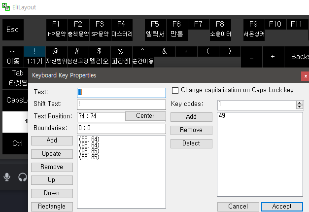 자세한 설명은 이 글의 범위를 넘어서므로 간단하게만 적자면 아래와 같이 키를 배치한 후 보이는 텍스트 설정해 주고 키 코드를 세팅해주면 된다. 이런 식으로 원하는 키들을 넣고 잘 배치하면 된다.